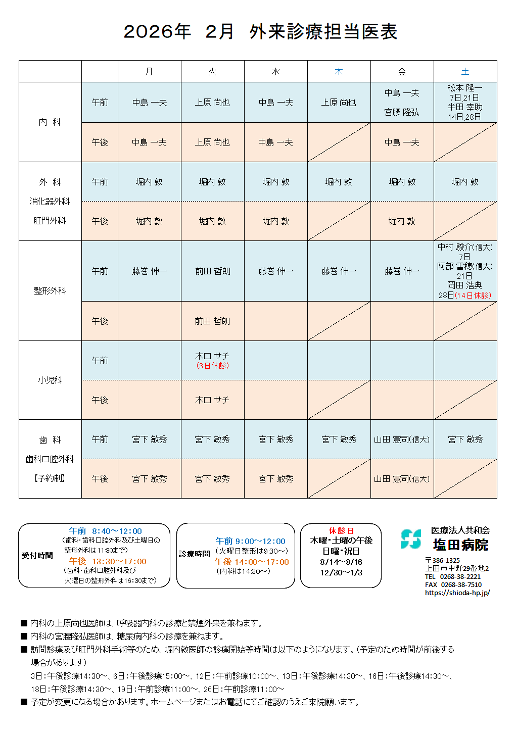 2026年2月の外来予定